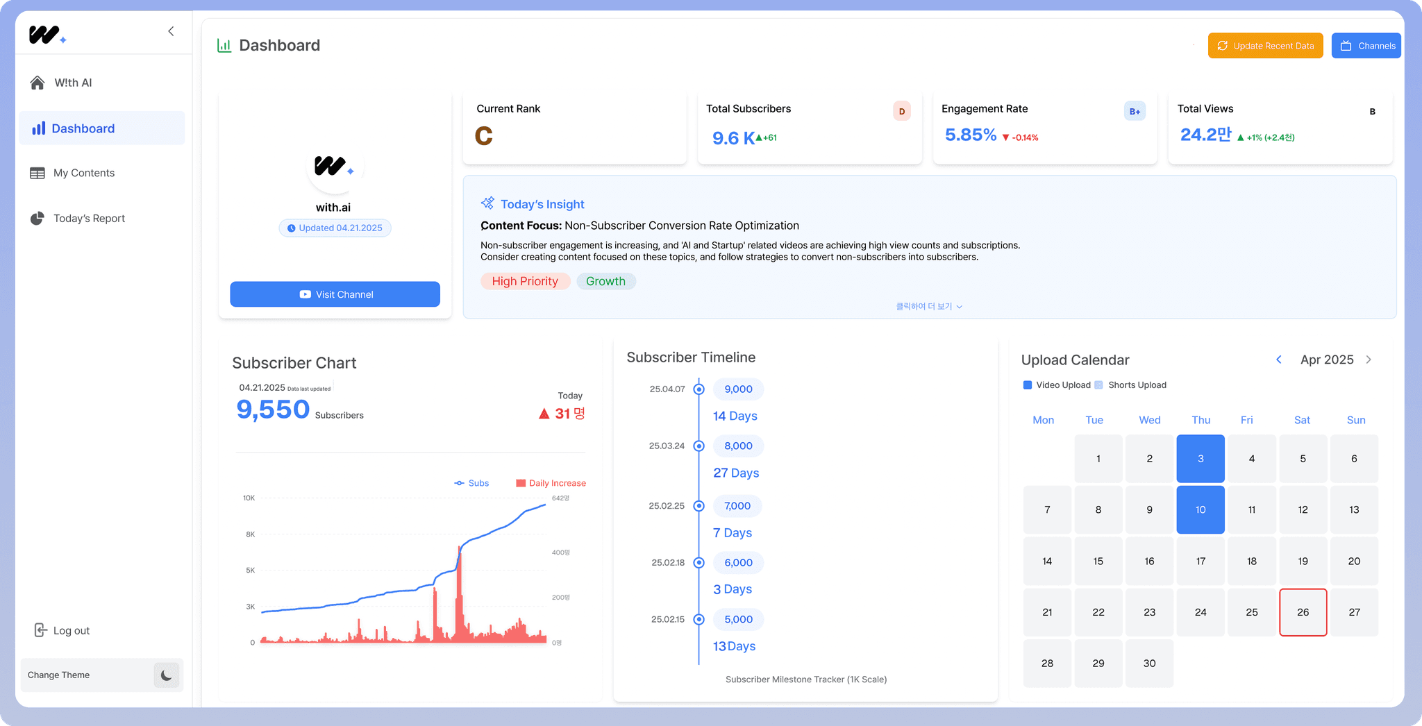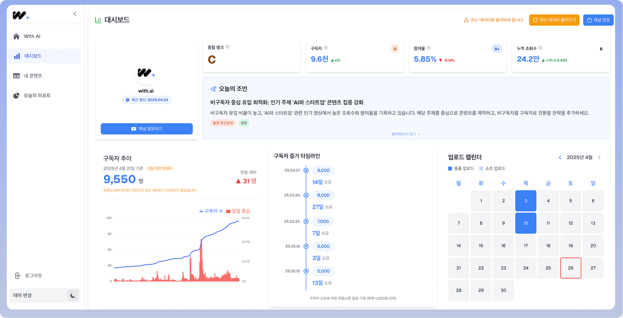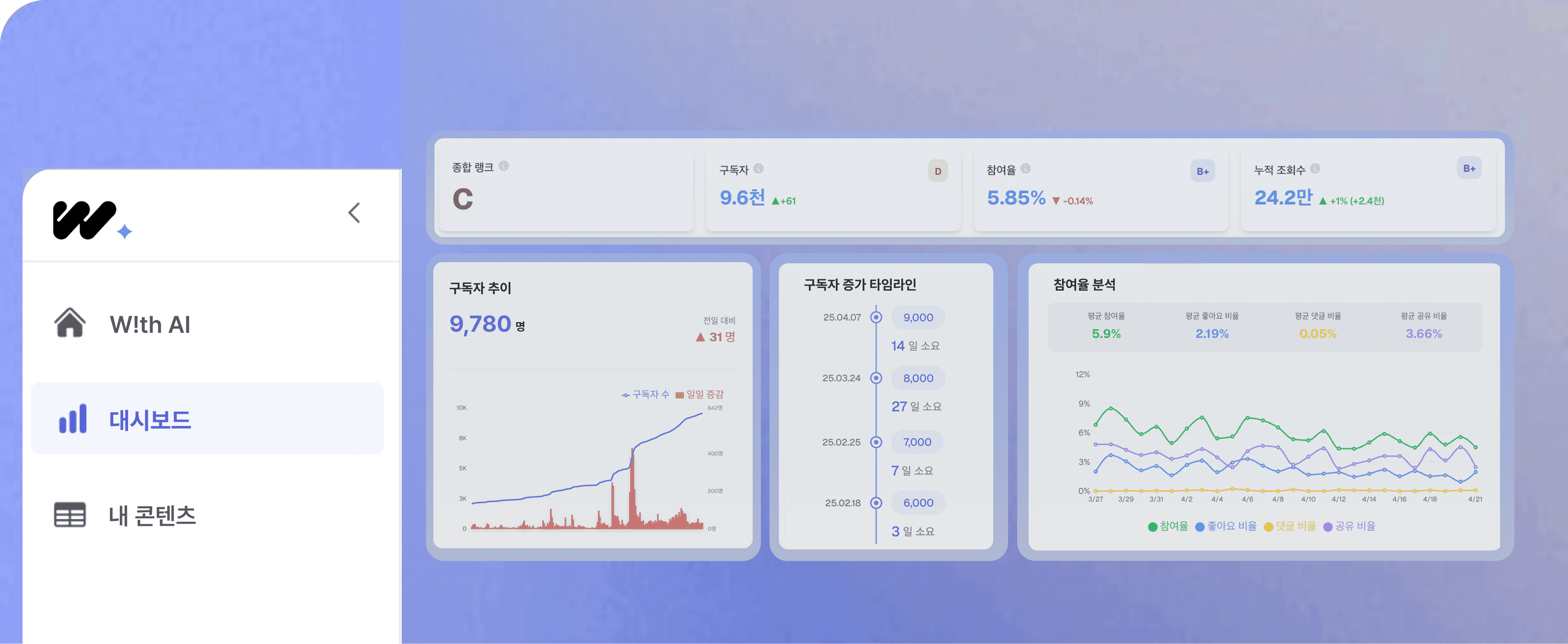 구독자 증가, 조회수, 참여율 등 중요한 변화를 한 눈에 보여드려요